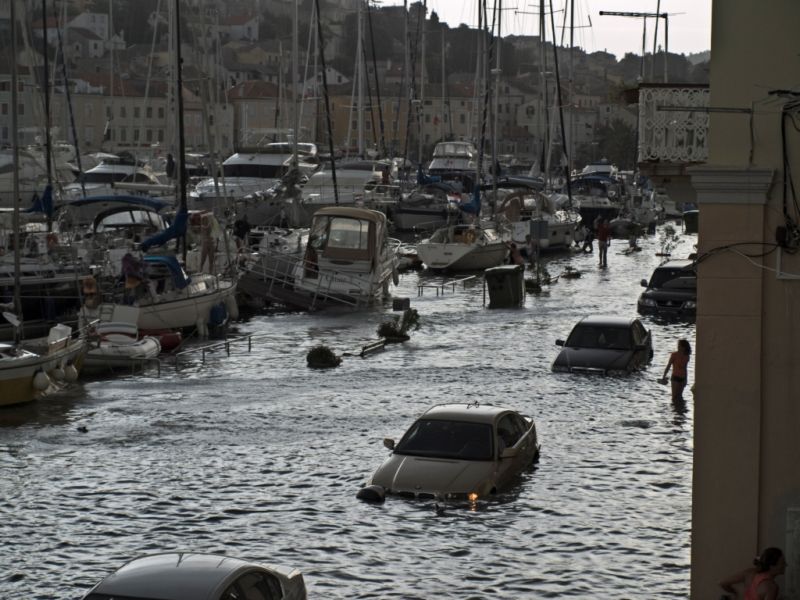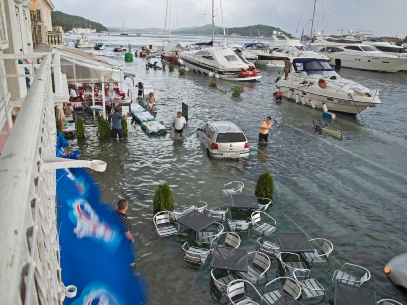 V Malem Lošinju se je včeraj malo pred 19. uro dvignil val v višini 1,5 metra in potopil Ulico Priko, Ulico lošinjskih kapetana in Trg Republike Hrvatske. Voda je zalila kleti in stanovanja, gostinske lokale in poslovne prostore ter dobesedno pometla gostinske vrtove.