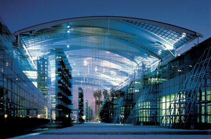 | Kempinski Munich, Nemčija Znan arhitekt nemškega porekla Helmut Jahn si je hotel zamislil v kombinaciji železa in stekla kot razstavni prostor. Hotel ima pet zvezdic in je lociran med obema terminaloma letališča. Hotel se baha z 389 zastekljenimi in izredno prostornimi sobanami, ujetimi v nosilno železno skeletno konstrukcijo stavbe. Hotel odlikujejo še wellness center, restavracija za izbirčne in velike konferenčne sobane. Več na www.kempinski-airport.de. |