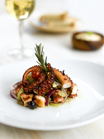 hobotnico na žaru s pečenim krompirjem in zelenjavo