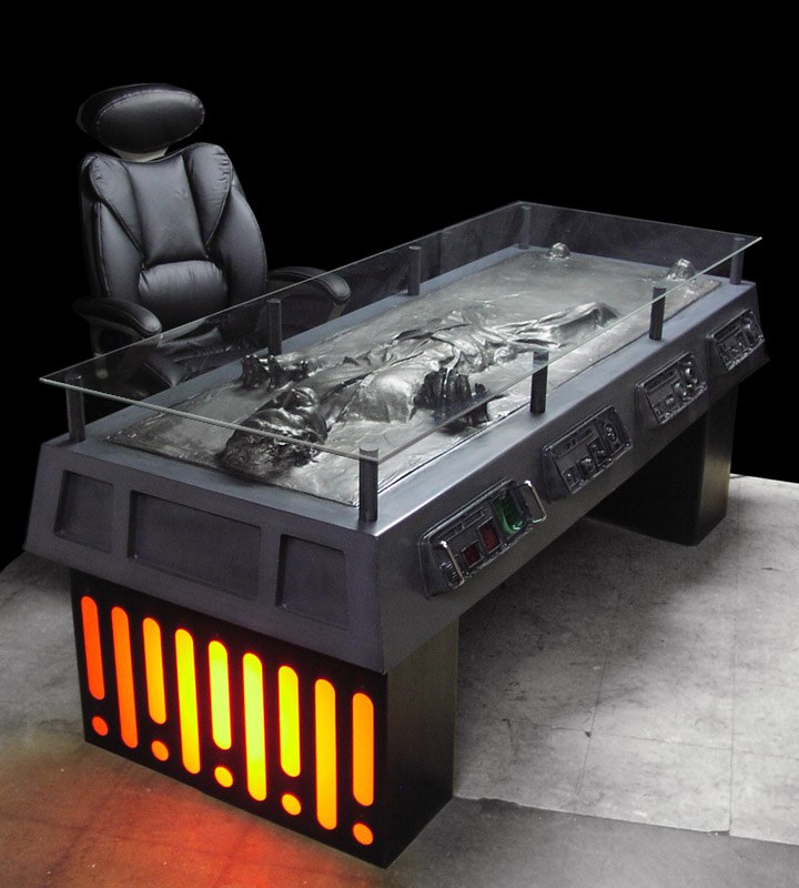 Če ste eden tistih, ki jim je v službi mučno sedeti za mizo, izpolnjevati kupe obrazcev, pregledovati vse neplačane račune, povrhu pa ste še navdušen oboževalec Vojne zvezd in morda Harrisona Forda, je oblikovalski duo podjetja Tom Spina Designs ustvaril pisalno mizo s podobo zamrznjenega Han Sola. Miza, ki so jo ustvarili v podjetju, specializiranem za izdelovanje skulptur, pohištva po naročilu, filmskih pripomočkov in unikatov za muzeje, gledališča, restavracije in zbiralce, je seveda unikat, cena pa zaenkrat neznana. Morda pa se produktivnost res zviša, če imate pred seboj ves čas nekoga, ki mu je gotovo še težje kot vam?